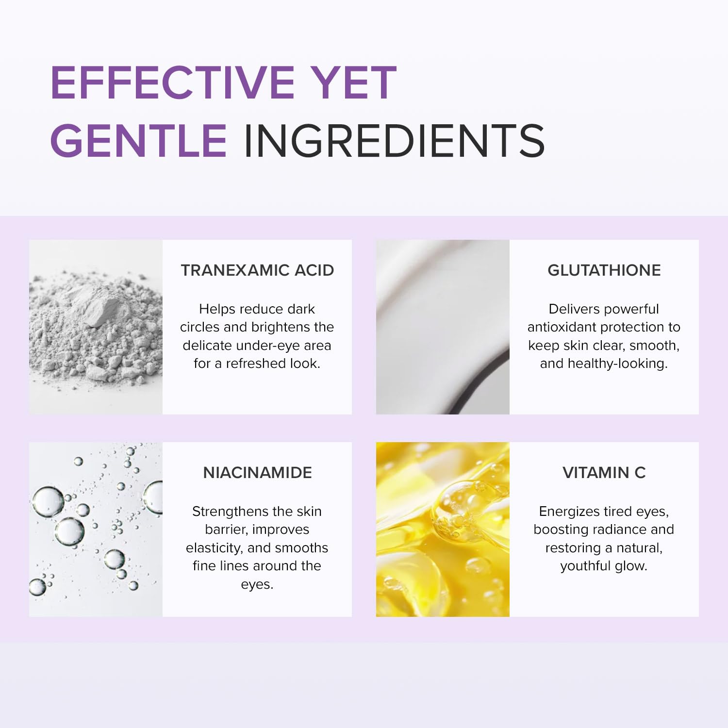 - Le glutathion, puissant antioxydant, et l’acide tranexamique, aux propriétés éclaircissantes, inhibent la synthèse de mélanine pour revitaliser le regard et lui redonner de l’éclat.